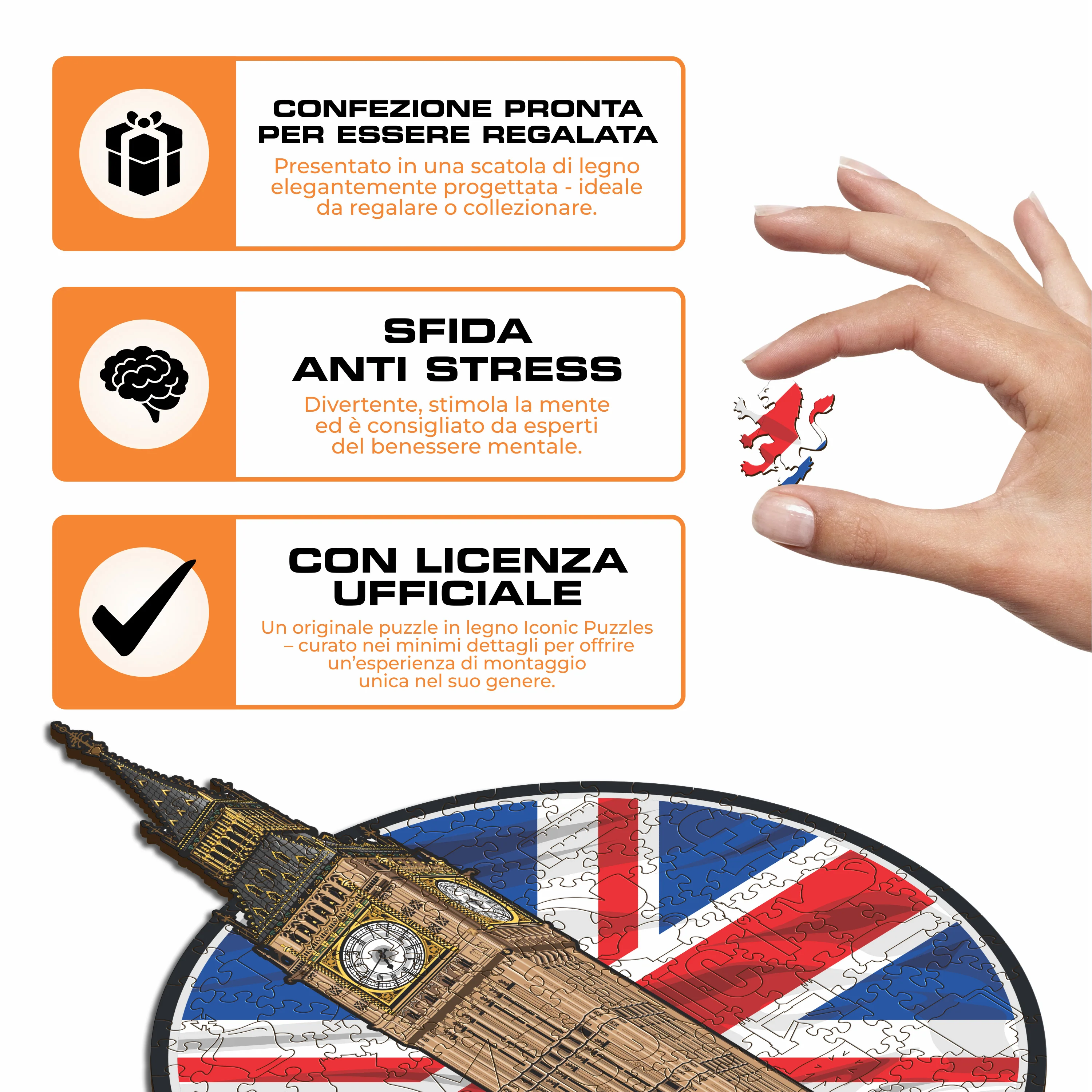 ✓ Ogni pezzo del puzzle ha una forma unica che raffigura elementi legati all'Inghilterra.